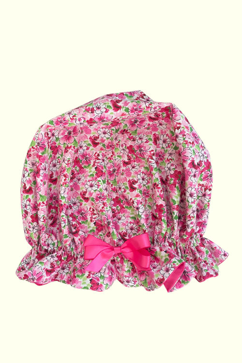This adorable pink floral bonnet features a ruffled edge and a bright satin bow for the perfect girly touch. Lined with smooth pink satin to protect your hair while keeping you stylish and comfy.